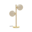 Defined style with a practical design brings cosmopolitan sophistication complimenting sleek decor. The smooth sturdy base anchors gold finished straight tubing with two silver spherical glass shades. The lamp's broad and sturdy base prevents tipping off.