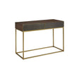 Its minimal legs are crafted from solid iron and have a rich gold finish that brings a warm metallic tone to interiors. Two cabinet is covered with textured shagreen and two slim storage drawers are incorporated into the design.