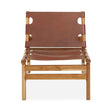This laid back chair has brown leather seat and back forming a sling design that is wrapped gently around an angular teak wood frame. The clean line design contributes to the minimal aesthetics of this chair, while the sturdy wooden base provides support.