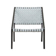 The chair's frame is crafted from natural teak wood and has a black colour that creates a sleek finish. A series of soft leather straps are tautly strung across the seat and backrest, producing a lattice design that opens up the aesthetic and provides a comfortable sitting experience.