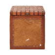 Each side features a natural hair-on-leather surface with metallic stud trim that adds to the textued look. Brown leather strips form a lattice pattern across the top. Open the lid with the metal ring handle to reveal useful storage space.