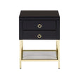 The Kensington Townhouse side table has a glossy black cabinet with a gold finish ring pull handle on its two drawers. Its legs are made from gold coloured iron, and the display surface is covered with mirrored glass.
