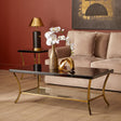 Its top surface has a glossy black colour, contrasting with the mirrored lower storage and display area. The legs gently curve, are made from iron, and have a reflective gold finish. Combine it with the matching side table.