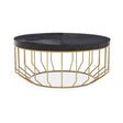 Creating a modern and luxe look couldn?t be easier. The Kensington Townhouse round coffee table has a black hair on hide leather tabletop, the organic feel of the top of the table is contrasted by a strong geometrical gold iron base.