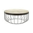 The grey iron lines that combine to form its cage-like base have a grey colour that is slightly distressed. The grey complements the white leather top, the latter segmented by stitching and boasting a textured finish. The tabletop is backed by sustainable mango wood and is trimmed with a band of soft brown leather.