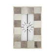 The outer frame is adorned with a patchwork of cowhide leather squares. The squares vary in colour and texture, creating a unique look. The clock face features a central white panel, providing a clean backdrop for the hands and markers, maintaining a modern and uncluttered look.