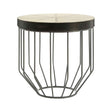 The frame of the round tabletop is made from eco-friendly mango wood and is dressed with genuine white and brown leather. A series of stitched lines create a wedge design on the table's top surface. These lines complement the tubular iron bar legs that descend from the top and angle at the bottom to produce a circular base.