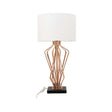 Boasting a decorative structural design, this table lamp will make a visual statement to a modern classic setting. A white fabric drum-shaped shade is neatly attached to a crossover metal frame in a bronze finish which sits atop a plinth marble base.