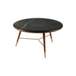 The Kenso coffee table boasts a round dark grey marble top with white veining adding a tonal contrast. A slim cylindrical line of metal, boasting a warm brass finish, joins three angled and tapered legs. The tip of each leg features a matching metallic finish, adding a touch of elegance to this statement cofee table.