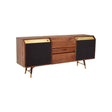 Comprised of several compartments, the Kenso sideboard opens up to reveal generous storage space including a deep central drawer. Two cupboard doors at each side feature black fabric facings, creating a textural contrast with the smooth surface of the wood. Brass finished accents and handles add a touch of elegance to this sophisticated statement piece.