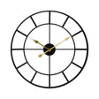 This large wall clock has an oversized double layer metal design with black finish circles and discreet numbering. Clean intersecting lines join in the middle to support the luxe dial with contrasting gold polished spade hands.