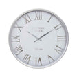 This wall clock has a sleek design featuring a silver metal frame, Roman numerals and spade hands. The elegant white face is complemented by the silver tone which adds to its luxurious appearance.