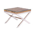 Natural salvaged wood forms rectangular top of this end table, further enhanced with the clear glass slab. The cross base in mirrored silver finish offers a tonal contrast to the natural elements and rustic texture.