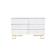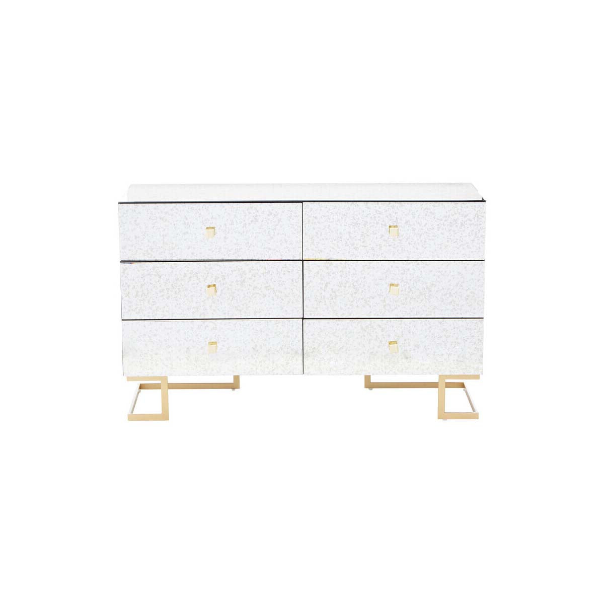 This six drawer chest comes in an exquisite design featuring a reflective antique mirror outer with hints of distressed effect. Each drawer has a brass finish square pull complemented with the sledge base.