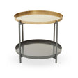 This coffee table features two rounded shelves with raised edges fixed neatly in a sleek and slender metal frame. The elegant contrast of matte gold and grey enamel coating enhances the modern glam appeal in the living area.