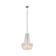 Skilfully crafted from wooden beads strung around a grey finish iron frame, this chandelier forms a tear drop shape. The cascading strands in white finish illuminate the environment with their smooth structure and bohemian essence.