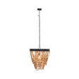 This chandelier features weathered wooden bead strings neatly cascading in waves around the black iron frame. This chandelier hangs vertically and gleams with a bohemian essence to a wide range of decors.