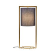 This contemporary table lamp has a sleek and linear matte gold finish metal frame with a rounded sledge base. The cylindrical black fabric shade at the top of the frame provides a sophisticated look and soft illuminating glow.