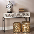 This rectangular console table features two drawers which are decorated by a geometric pattern combined with a hint of weathered effect. Its top section rests on two metallic sled legs which are given an additional angular support at the rear. Each drawer provides an ample storage for small items and can be easily opened with a handle.