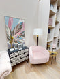 This chic chair is upholstered in pink velvet that is smooth to the touch. It features a plump backrest with arms that wrap around to envelop the round seat. Single line stitching adds texture while tracing the chair's lines. Its slim angled legs are made from metal and coloured a rich gold to complement the pink velvet.