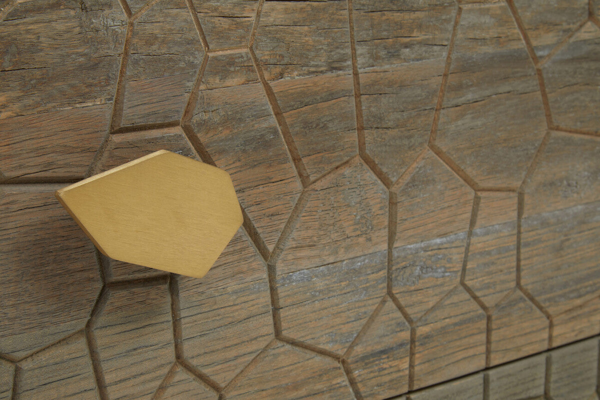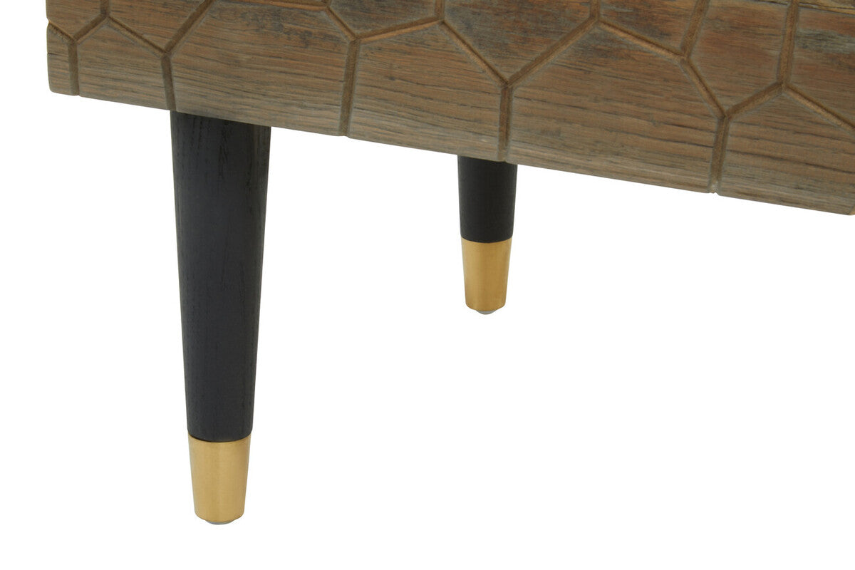 Skilfully handcrafted from recycled elm wood, this four-drawer chest offers ample storage and shelving space. Each drawer front features subtle textured carving, adding depth and character. The natural wood finish is beautifully contrasted by black-finished wooden legs, while gold-toned knobs lend a refined touch of elegance.
