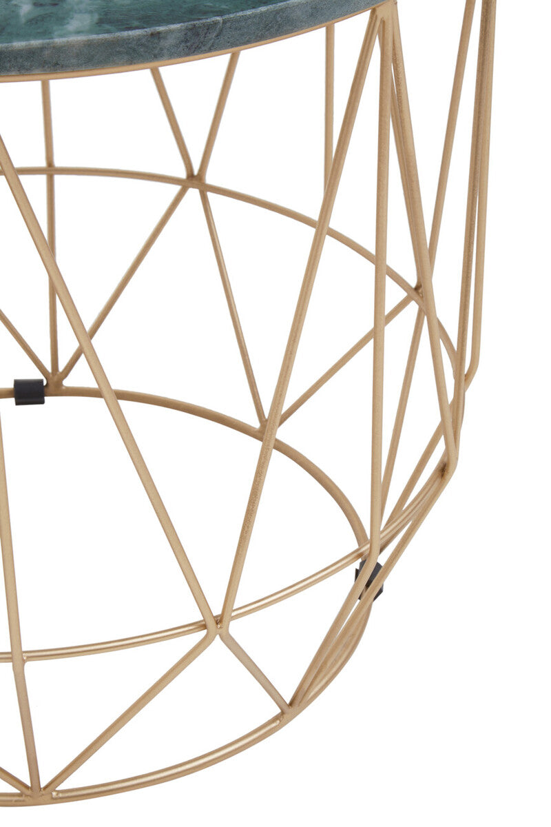 Big on the surface but small to the sight, this side table has a sleek, geometric cage like frame and merged clean lines, the round green marble top perfectly complements the gold polished iron base frame.