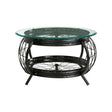 A round, clear glass top allows the table's bicycle spoke style frame to be fully visible. The intricate iron frame boasts a sleek black finish.
