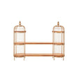 The two cage design of this shelf unit is joined by two long wooden shelves. The distinctive design is formed from strong iron with an luxe champagne gold finish to complement the natural hues of the wooden shelves.