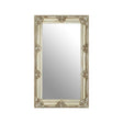 This wall mirror has a thick frame with a metallic champagne colour that styles with silver-toned lighting and accessories. It is replete with neoclassical motifs, arranged in symmetrical form that conveys a sense of order and calm.