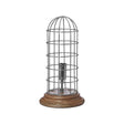 A cylindrical, dome-topped cage is attached to the robust wooden base via screws. Enclosed in the silver finished cage is a single light bulb holder, left exposed to enhance the factory floor aesthetic of the lamp.