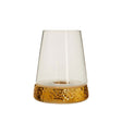 Hammer points create a series of waves and scores, adding subtle texture to the base and creating a shimmering effect when placed under the light. The shade is made from clear glass and has a tapered design.