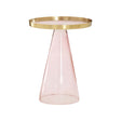 This side table features an inverted cone shaped base supporting a round acrylic top with gold finish raised iron edges. The pink and gold combination gives the side table a luxe appearance and makes it an accent piece.