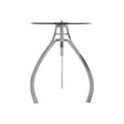 This table features reflective nickel finish tripod legs. A functional crank mechanism is integrated into the legs to raise or lower the table's height. Made from clear glass, the rounded and sleek tabletop coordinates with the polished frame while providing a clear view of the machinery beneath it.
