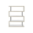 The unit stands at over five feet tall and features four wide storage and display shelves. Its eye-catching inverted aesthetic is achieved thanks to the opposing alignment of the side supports on the shelves. The unit has a glossy white finish which complements the two sleek stainless steel poles positioned on each shelf.
