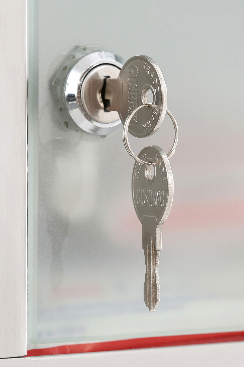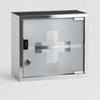 The cabinet is made from tough stainless steel, with a chrome finish that gives it a contemporary look. Its door is made from frosted glass which makes it semi-transparent, with a cross design in the centre that symbolises the cabinet's function.