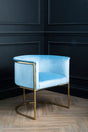This chair features a plump seat upholstered in blue velvet that sits atop a curving inner backrest fixture for added comfort. The sturdy stainless steel frame in a gold finish lends an arching accent to the d?cor with its sleek design.
