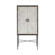 The cabinet is made from sustainable elm wood and are supported by black iron legs. Its doors have a striking carved starburst design with textured finish in a cool grey finish. The design incorporates ample storage space for glasses, bottles, and accessories.