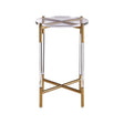 Sporting a minimalist design, the Miley side table has a clean lined, cross design base of acrylic and rich gold finish steel legs. A clear acrylic round top with smooth edges neatly sets on its frame giving a modest counterpoint to the reflective, warm metallic accent. Style this accent piece with luxe-design furniture and acessories.