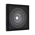 This abstract art has a sunburst style 3D iron structure with a small round mirror in the middle. It is enclosed in a black MDF frame with a black fabric background that sets off the silver tone of the metal plate.