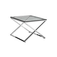 The sleek clear tempered glass is robust for everyday use. The criss cross design ensures stability and sturdiness, while helping to accentuate the style. The minimalistic design of this side table will complement most decors and make a great centrepiece in any living area.