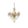 Droplet shaped pieces of refractive K9 crystal are draped from the outstretched arms of this exquisite chandelier. The arms are made from glass and have a translucent cognac colour that matches the crystal. A candle bulb sits on the end of each of the eight arms. Two carved cognac glass spindles encase the chandelier's iron pipe, while a silver iron link chain suspends it from the ceiling.