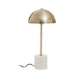 This floor lamp has a sleek metal structure in a gold finish, featuring a slender stem that extends to support a dome shaped shade. A cylindrical white marble stone base adds stability and softens the overall visual aesthetic.