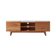 The Myan two door media unit, topped with elegant white marble, seamlessly blends contemporary design with functionality. Perfect for storing remotes, magazines, and more, its legs and base are crafted from sustainable acacia wood.