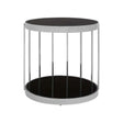 The Novo silver side table features round top and base made from tempered glass that boasts a sleek black finish, counterpointing the cool metallic frame. Style with cool metallic accessories for a coordinated look.