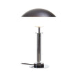 This table lamp has a modern design with a silver finish metal body and a glass globe beneath a black lampshade. The flying saucer shade is complemented by a round black marble disc on the base, creating an art deco inspired look.
