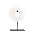 This exquisite extra small sculpture features a smooth, round onyx disc with the inherent patterns and natural veining of the stone highlighted by a polished finish. The sculpture is gracefully presented on a contemporary black metal frame, offering a clean and minimalist aesthetic.