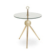 Oria clear glass gold frame side table will instantly add a luxe edge to any decors. This stylish side table features a contemporary design with tripod metal legs descended from a globe and a glass with passed trough metal column.