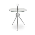 Oria clear glass stainless steel silver frame side table will instantly add a luxe edge to any decors. This stylish side table features a contemporary design with tripod metal legs descended from a globe and a glass with passed trough metal column.