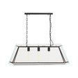 With an antique black finish metal structure encased in a clear glass frame, this pendant light boasts an angular shape ideal for subtly industrial abodes and urban lofts. The light has three bulbs providing ample downward lighting on the surface.
