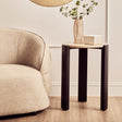 This round side table has cream marble top, in a smooth finish, offering a touch of luxury to the living room. Crafted from black finish acacia wood, its sturdy legs create a striking and visually appealing design, making this monochromatic side table a perfect focal point for modern living rooms.